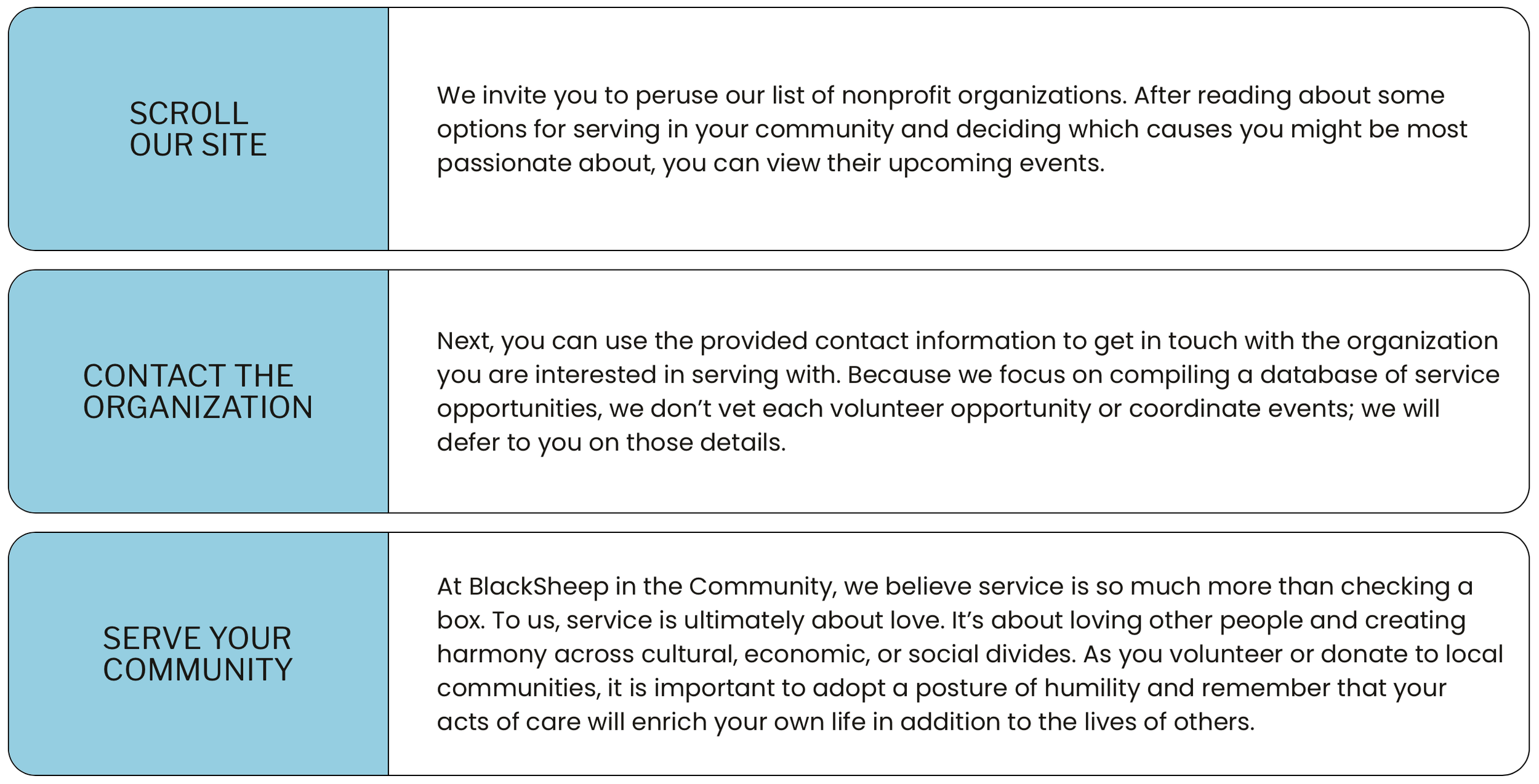 We are incredibly grateful for the service organizations and volunteers already at work in our community. That said, we know it can be difficult for these two separate entities to find each other. With our accessible database of service opportunities, BlackSheep in the Community aims to connect a diverse group of volunteers and organizations so they can make a difference, together.